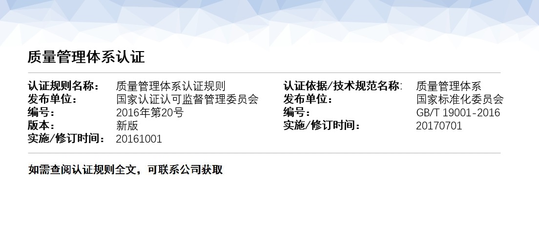 质量管理体系认证是指由取得质量管理体系认证资格的第三方认证机构,依据正式发布的质量管理体系标准,对企业的质量管理体系实施评定,评定合格的由第三方机构颁发质量管理体系认证证书,并给予注册公布,以证明企业质量管理和质量保证能力符合相应标准或有能力按规定的质量要求提供产品的活动。