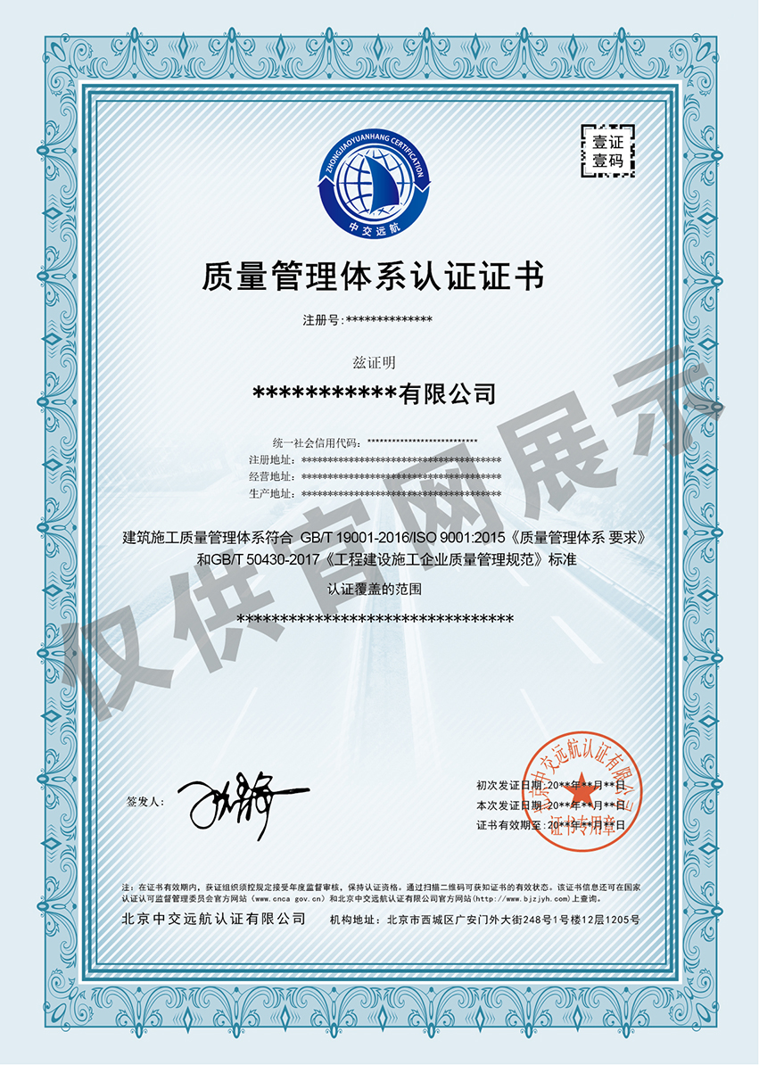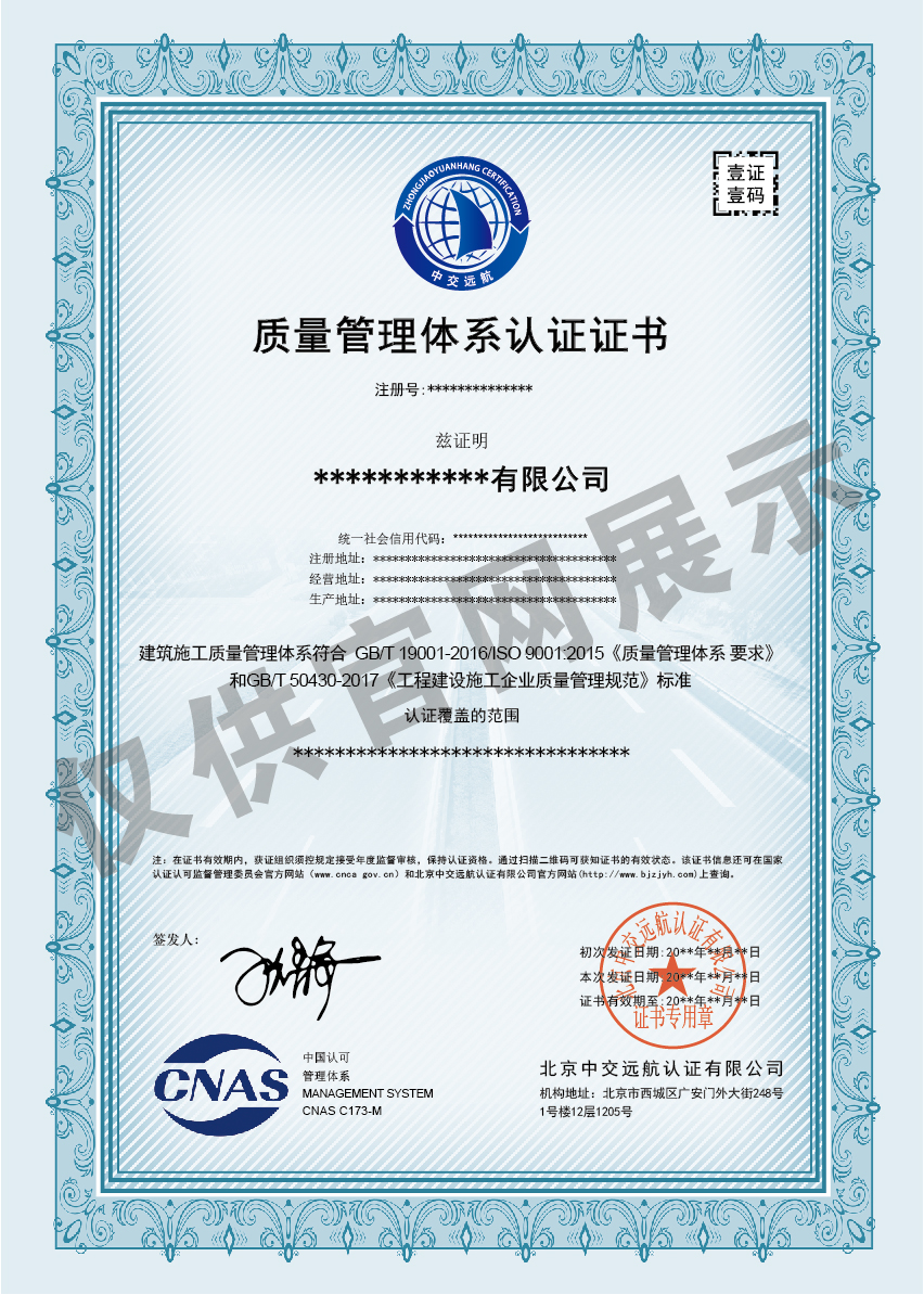 工程建设施工企业质量管理体系(50430)认证证书展示
