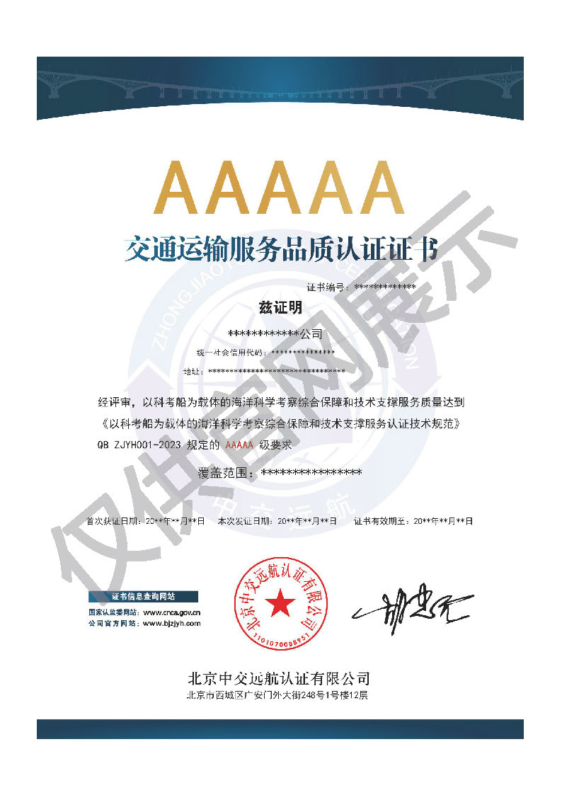 以科考船为载体的海洋科学考察综合保障和技术支撑服务认证证书
