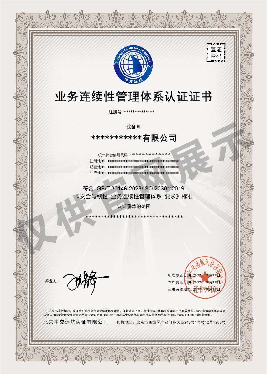 业务连续性管理体系认证证书展示