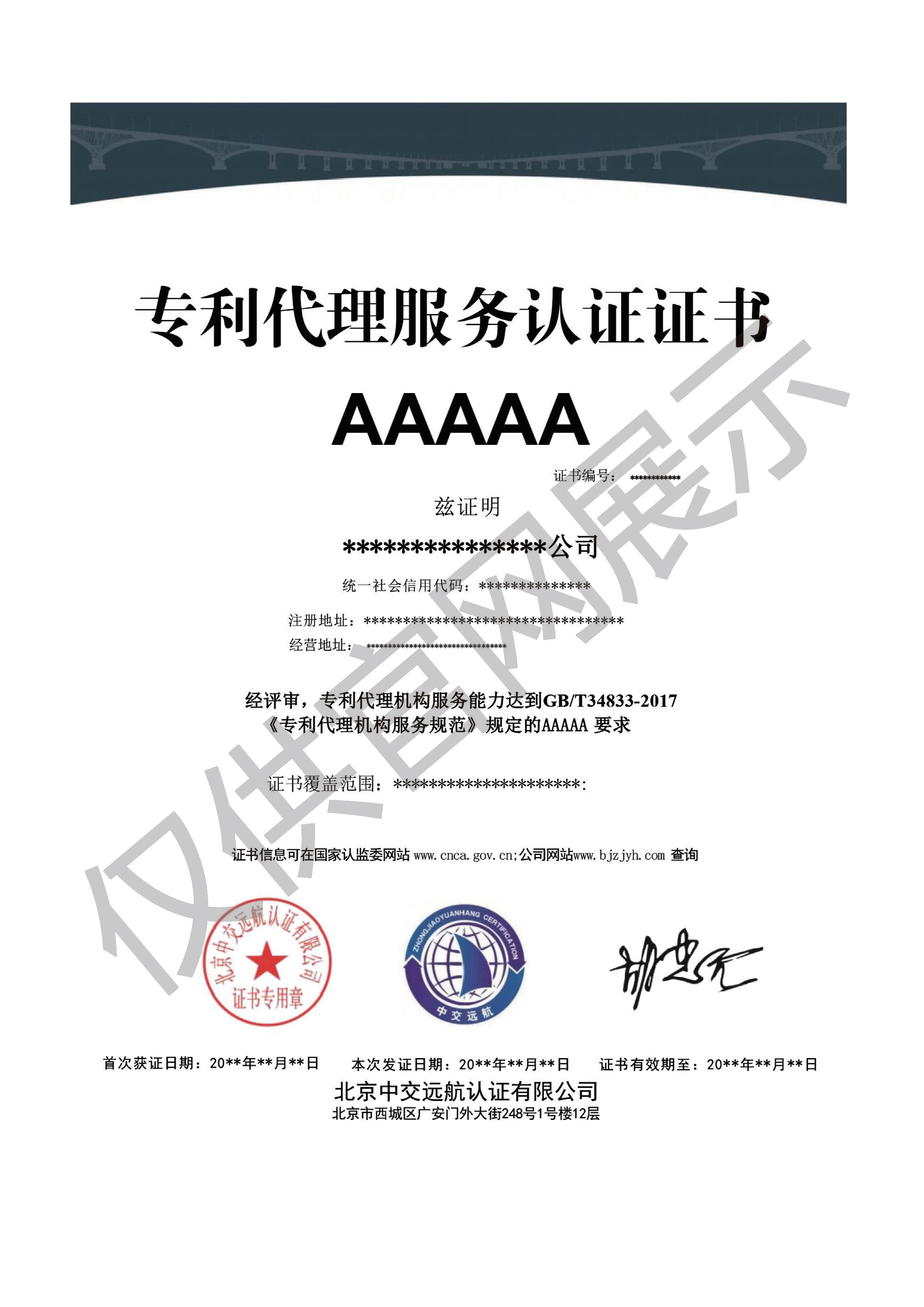 专利代理机构服务认证证书展示