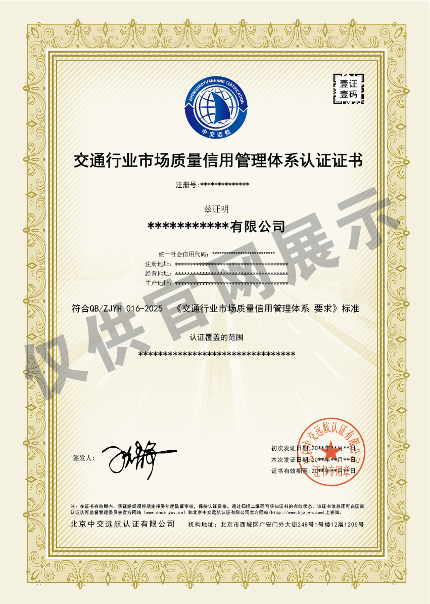 交通行业市场质量信用管理体系证书展示